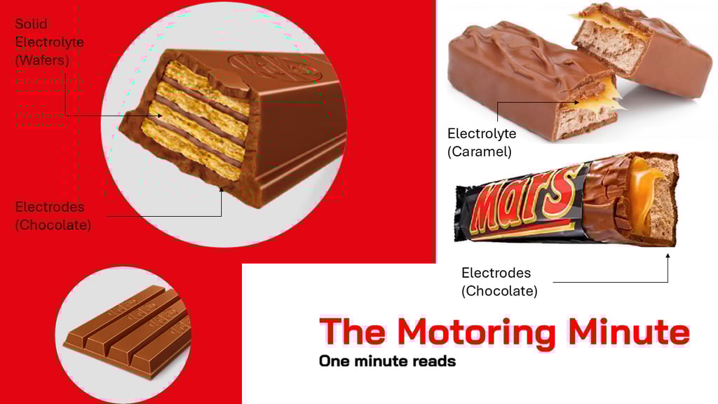 I am sure you have read about Lithium ion battery on the spec sheet of every EV! To give you an example conventional of a Lithium ion battery, it is like a chewable soft caramel candy bar for example Mars or 5 Star. The Caramel is the electrolyte which is squeezed in between two chocolate layers that are electrodes (Anode +ve and Cathode -ve). As you chew or squeez the caramel candy the caramel flows through electrodes and you can enjoy the taste of it, which is how the electrical power is stored and released through the battery. Now, the Solid state battery is like a Wafer Chocolate, like a Kit-Kat! Instead of caramel as gooey electrolyte, here the wafer is a solid electrolyte in between two chocolate layers (electrodes). In this case the wafer doesn't flow as you squeez the chocolate and you can enjoy your wafer chocolate without getting messy improving safety! One can have a multiple thin layers of electrodes (chocolate) therefore making it compact, efficient and reliable than the the Lithium ion batteries.